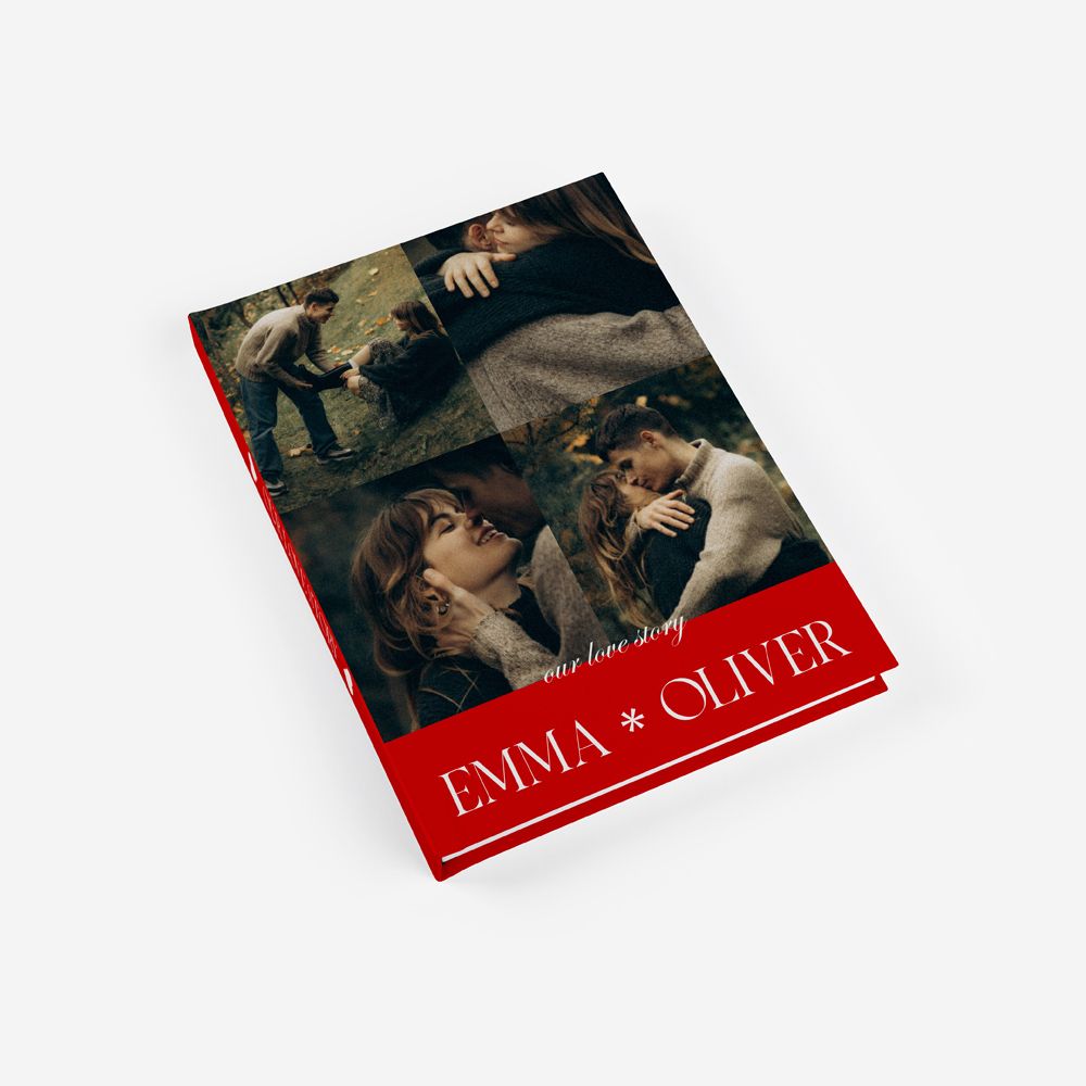 Transforme a história de vocês em uma verdadeira edição de colecionador com o tema Love Story. Com uma estética editorial e cinematográfica, este álbum valoriza a foto favorita do casal em grande destaque, complementada por uma faixa vermelha marcante e uma tipografia elegante. É a escolha ideal para casais que desejam eternizar seus capítulos com o glamour e o protagonismo de uma capa de revista.