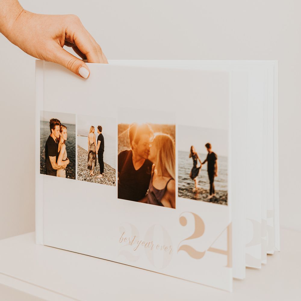 Ideal para 35 a 55 fotos, o Álbum Landscape valoriza suas fotografias horizontais com elegância.