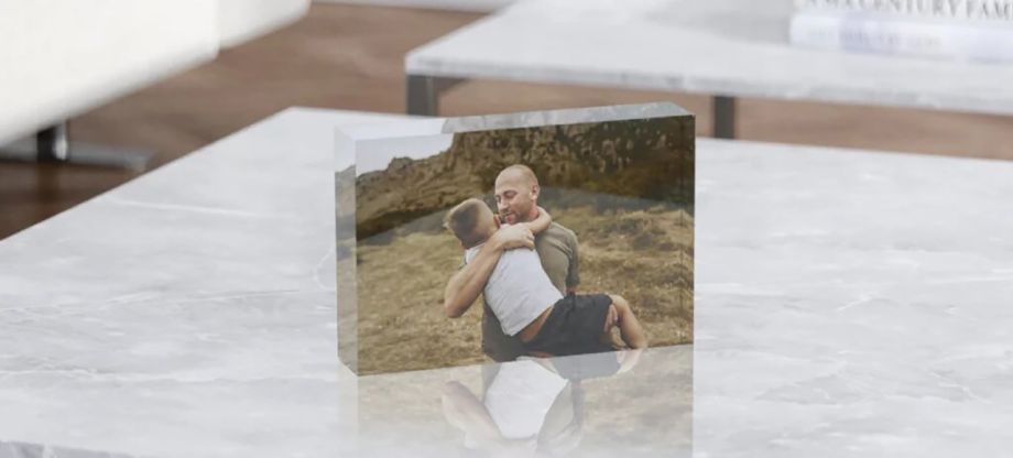 O acrílico extra translúcido de 20mm de espessura, recortado a laser, sem arestas ou rebarbas, resulta em um porta-retratos único com efeito de profundidade 3D.